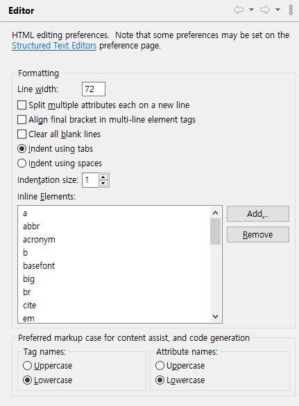 - 추가로 하단에 Incline Elements 에 줄바꿈을 제외하고싶은 태그를 "Add..." 를 눌러 추가 할 수 있습니다.