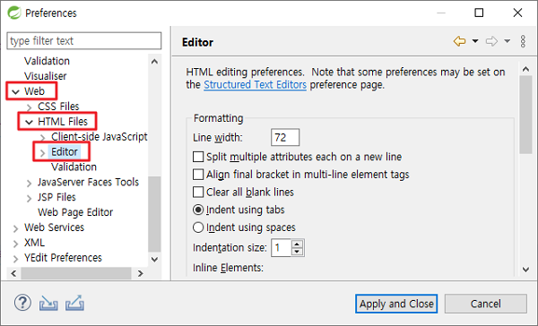 이클립스에서 JSP, HTML에서 자동정렬기능 (Formatting, Ctrl+Alt+F) 사용시 줄 정렬이 이상하게 되는 상황이 많이 발생한다.