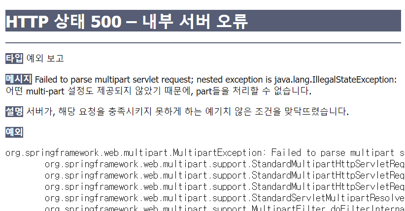 org.springframework.web.multipart.MultipartException: Failed to parse multipart servlet request; nested exception is java.lang.IllegalStateException: 어떤 multi-part 설정도 제공되지 않았기 때문에, part들을 처리할 수 없습니다.
