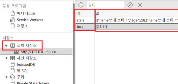 브라우저의 개발자모드 애플리케이션에 가면 로컬저장소(LocalStorage)를 확인할수 있다.