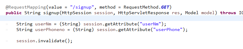 다음과 같은 화면을 보여주는 컨트롤러는 값을 가져오고 서버에 있는 데이터값을 지우기 위해 세션 invalidate();