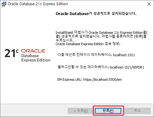 - 오라클 데이터베이스 21c XE 버전이 차례대로 설치됩니다.