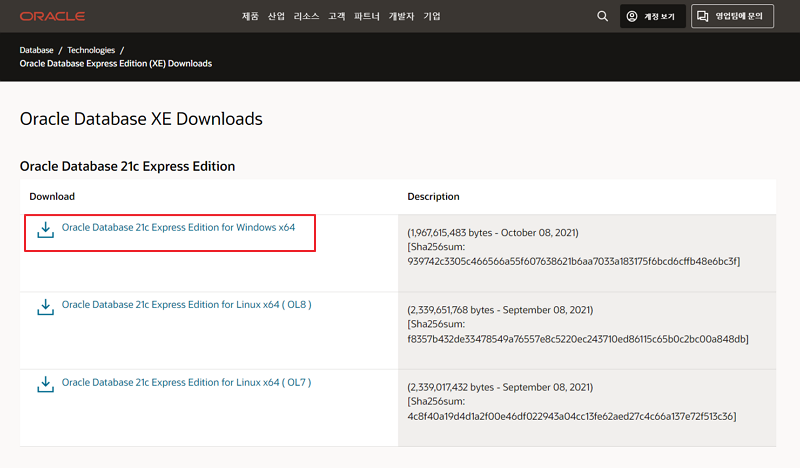 웹사이트 이동 : https://www.oracle.com/kr/database/technologies/xe-downloads.html