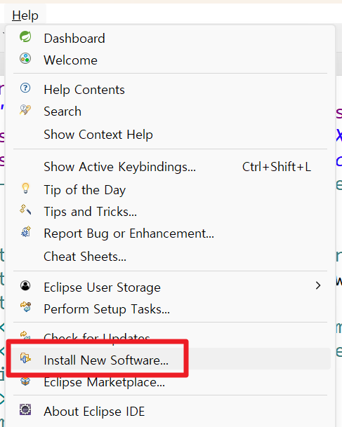 - 이클립스 상단 메뉴 - "Help" - "Install New Software..." 메뉴에 들어간다.