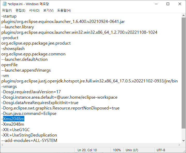 Xms2048m 으로 수정 (Heap 최소 최대 메모리 설정)