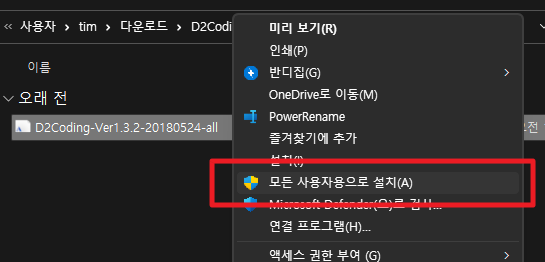 폰트 파일에서 오른쪽 버튼을 눌러 "모든 사용자용으로 설치(A)" 를 선택합니다.