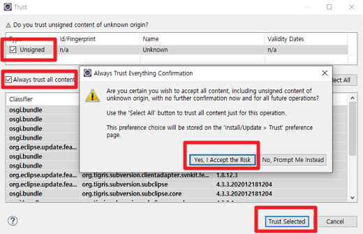 - 설치 중간에 Trust 경고창이 발생하는데, Always Trust all content를 눌러 모두 신뢰로 설정해 줍니다.